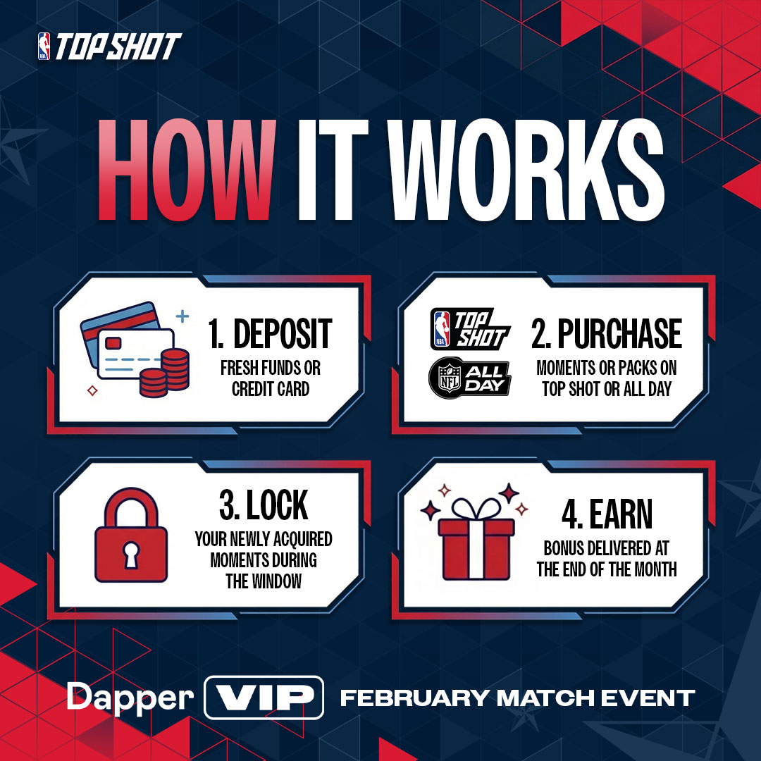 From Monday, February 9 at 12 PM ET through Sunday, February 23 at 11:59 PM ET, you can earn bonus Dapper Balance when you add funds, collect Moments you love, and lock them during the promotional window.