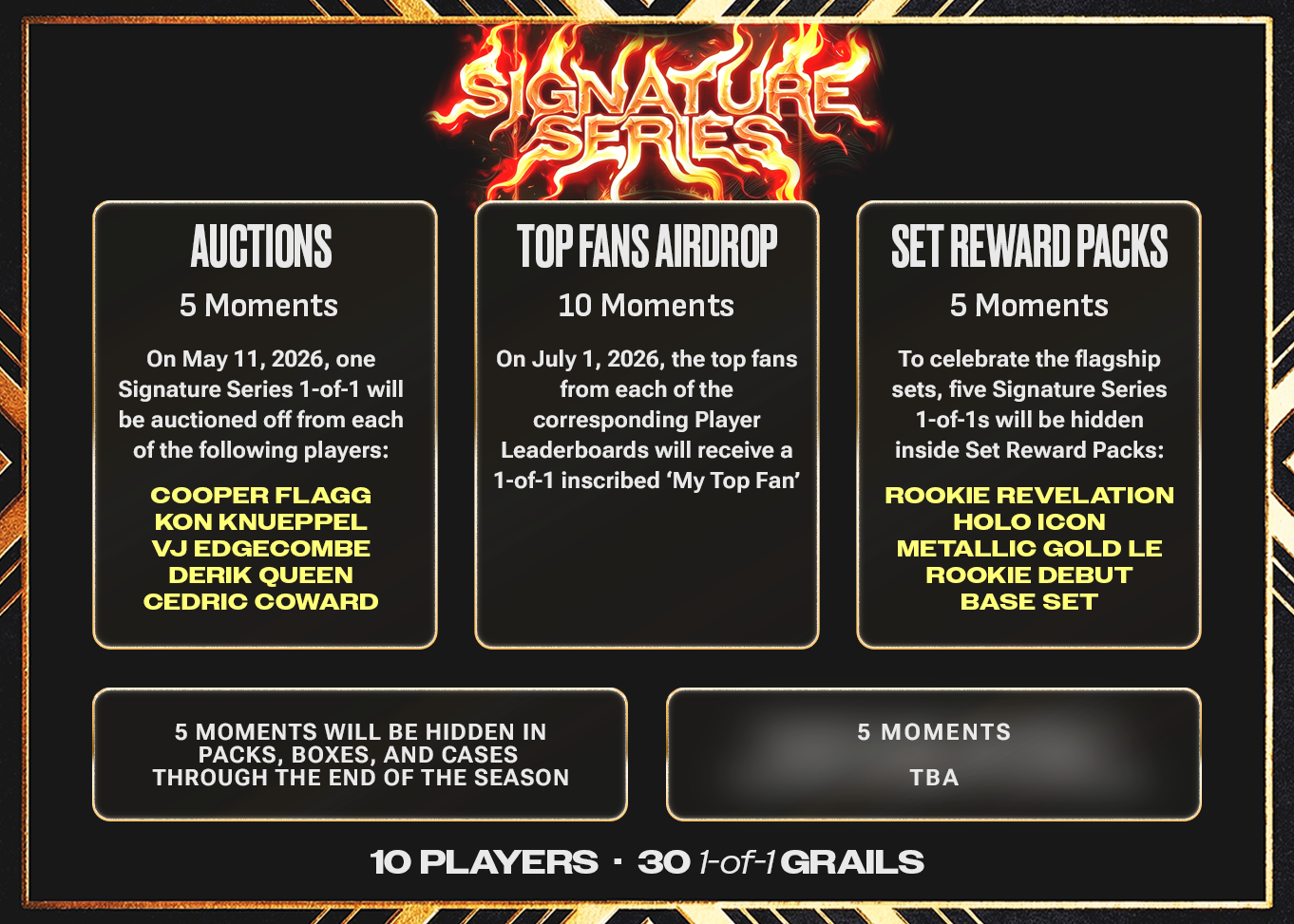 The headline: 20 of the 30 Signature Series Moments will either airdropped to Top Fans or earned through Set Reward Packs and Trade-In Auctions.